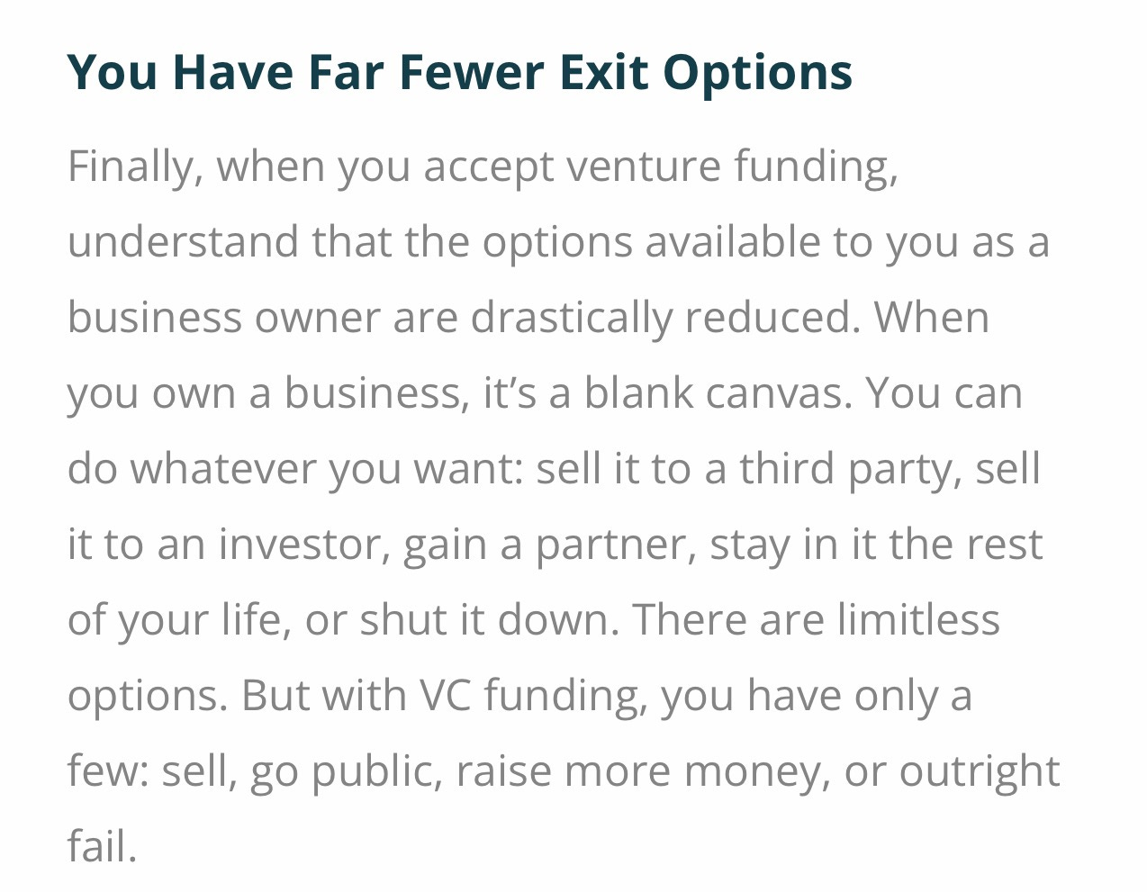 Keep in mind that this is why the decision to raise venture capital in the first place is such a monumental decision and shouldn't be taken lightly because once you're on the venture treadmill, you risk losing degrees of optionality. I liked this framing around the risks: