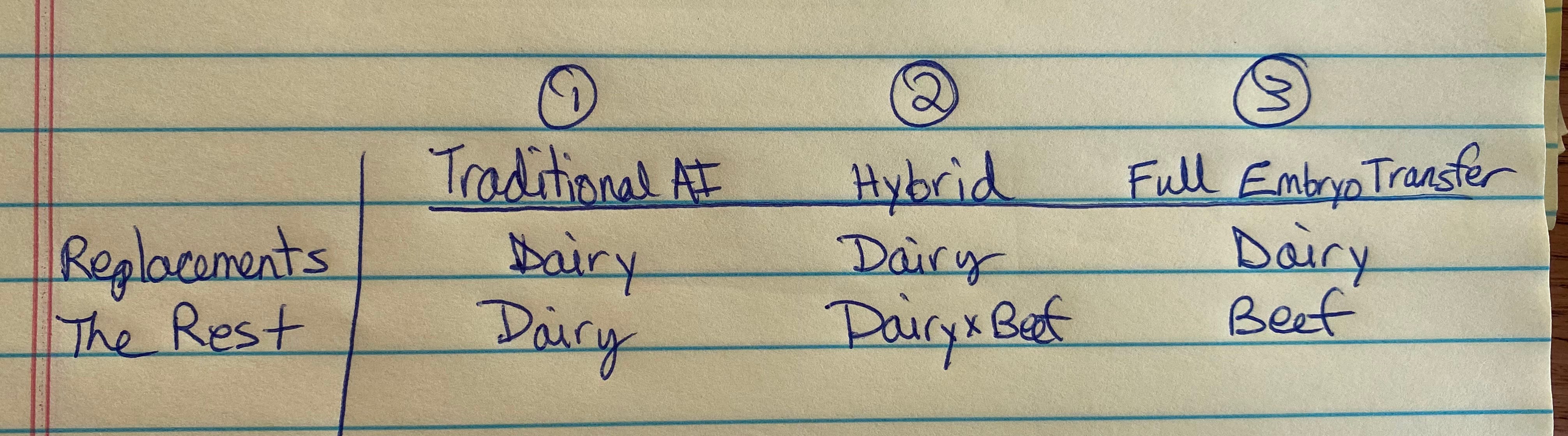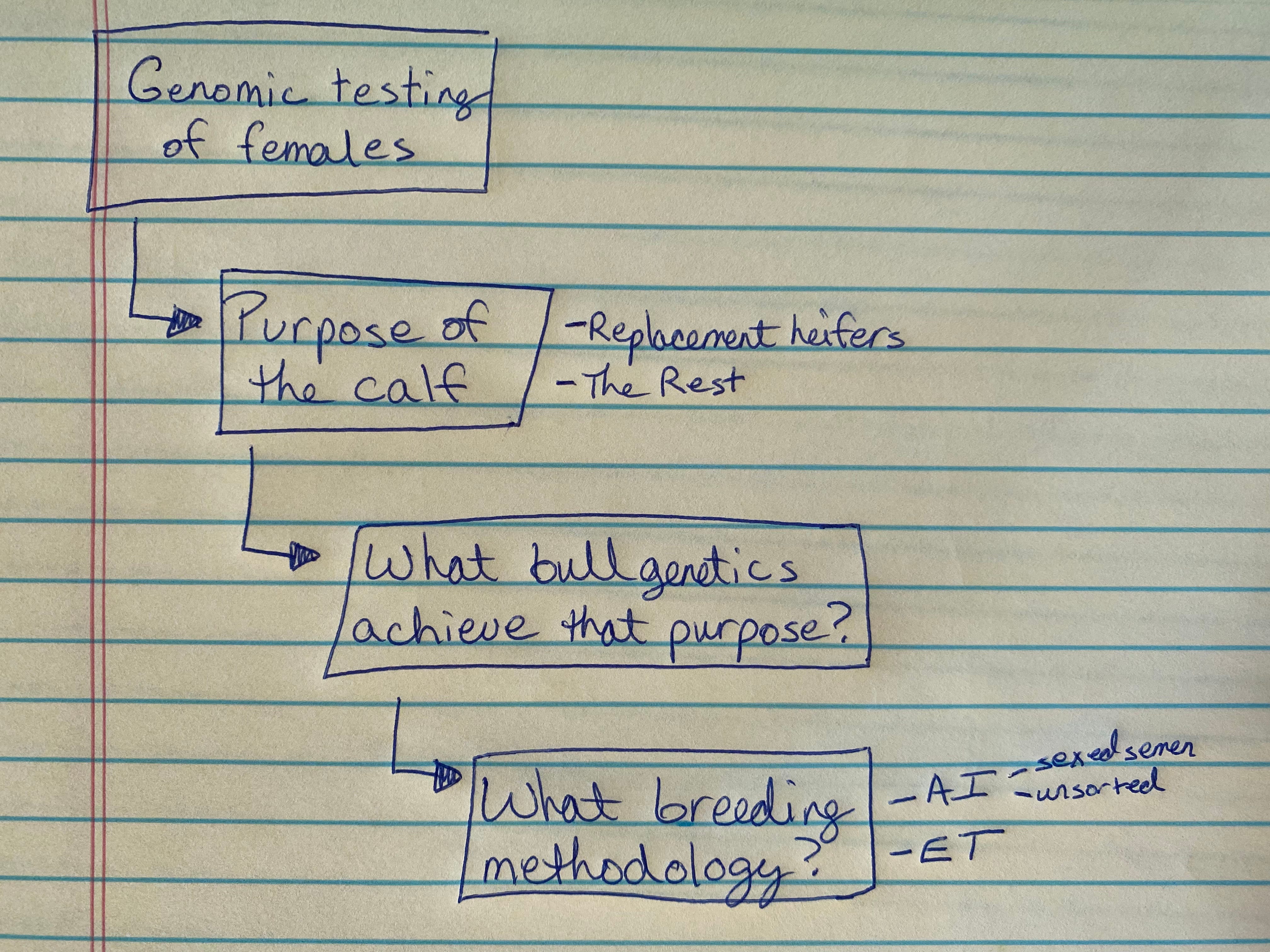 Until genomic testing became wide spread, the decision of which bull genetics to use via AI was the primary decision - that was kinda it. Genomic testing flipped the script by unlocking a preliminary decision point about every female. Genomic testing allows the producer to understand the right place in the dairy’s genetic program for each individual heifer/cow based on her genetic potential. This serves as the foundation of the strategy because it sets up the next question….
