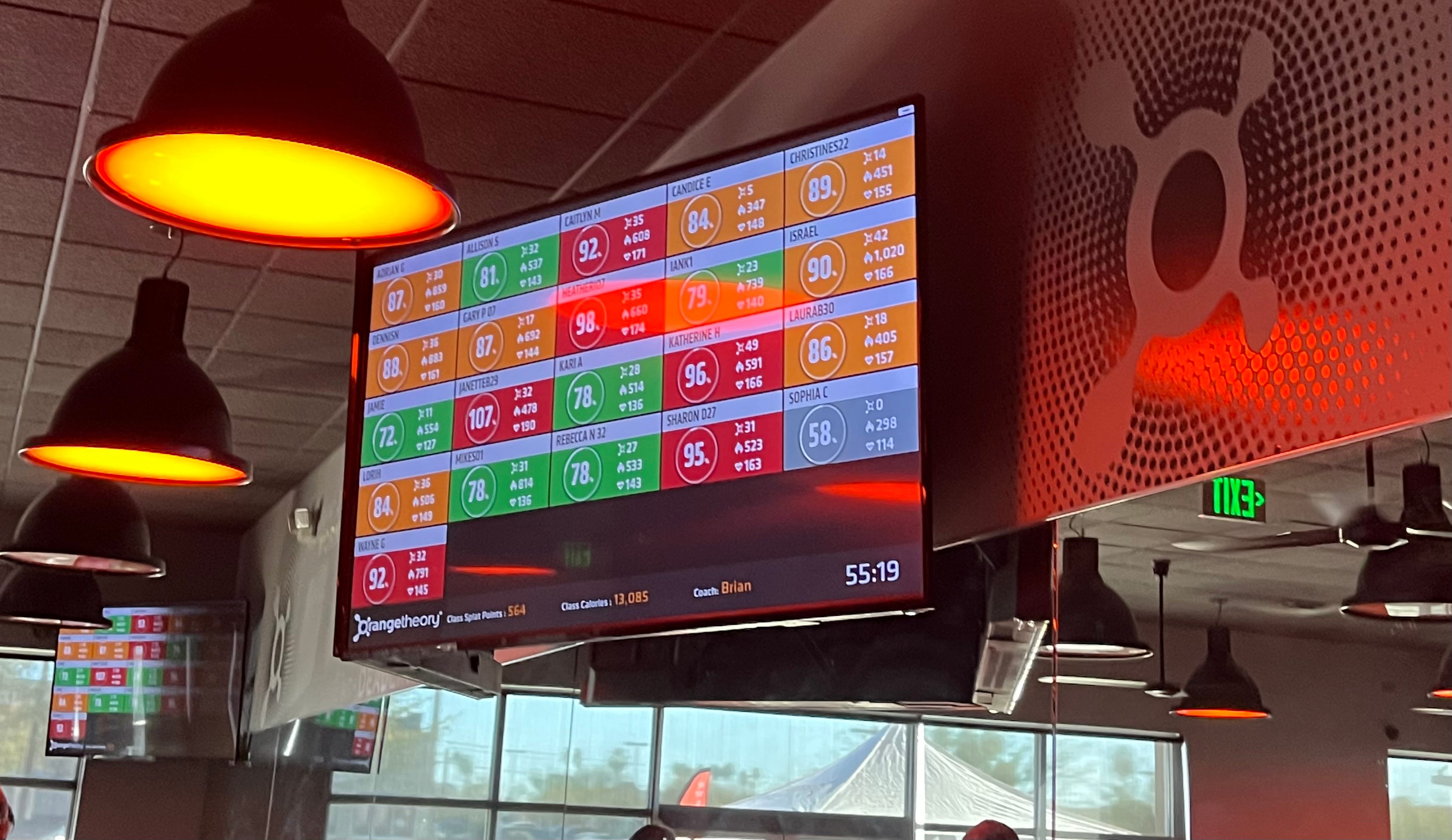 That front & center, color coded, real time scoreboard. There are big screens at the front of the gym with everyone's names in a block that changes color as your heart rate increases, relative to your resting heart. The color zones are based on your current heart rate as a % of your maximum heart rate, and it progresses from gray to blue to green to orange to red. The data is pulled from the heart rate monitor you wear during the workout.